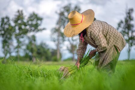Thai Farmer Working in farming With green seedlings. To be planted in Organic rice fields