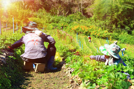 illustrations,december 2,2016,in winter at chiang mai province thailand,morning with planter in strawberry farm, farming gardener and worker harvest strawberries