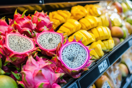 Colorful supermarket shelf displays an array of exotic tropical fruits like dragon fruit, mango, and papaya, inviting shoppers to explore fresh flavors.