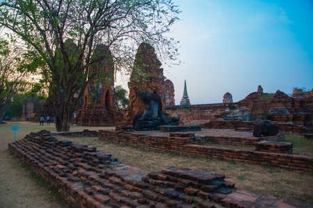 Old ruins of a temple in Phra Nakhon Si Ayutthaya province near Bangkok, Thailand. An old buddha statue in ancient temple. Famous tourist attraction landmark. History of Thai architecture.