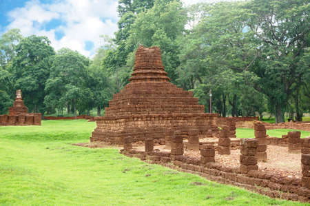 Ruin of pagoda and stone pillar, is a World Heritage at Si Satchanalai Historical Park, Sukhothai, Thailand