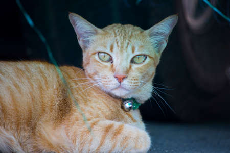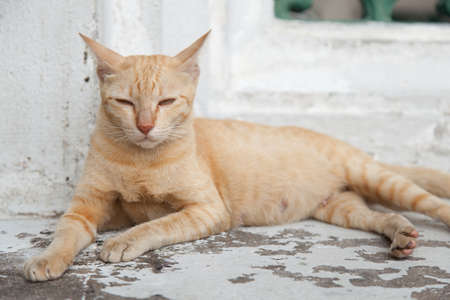 Selective focus of relaxed cat are sleeping on the floor laying in Thailand, Space for text in template, yellow cat
