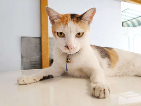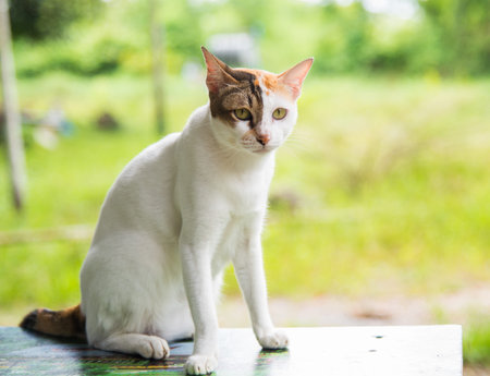 Beautiful three colors thai cat on the table happily natural background