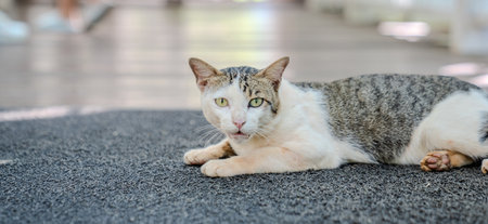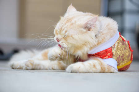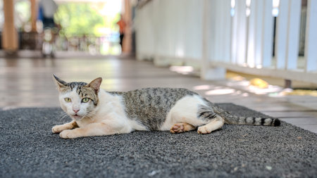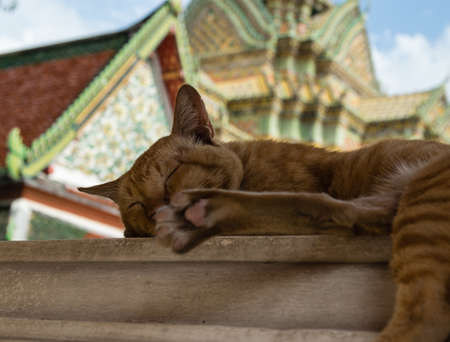Traditional local asian cat lying in temple of Bangkok Thailand