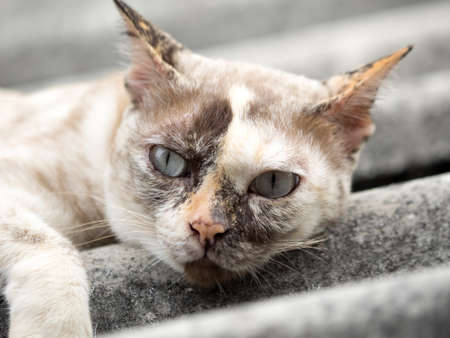 Colored street cat resting in floor table in garden park close up