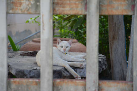 A Thai cat is lying on the ground in the garden. Selective focus.
