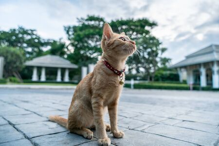 Hi-res photo of a cute orange cat is sit on the with blurred background or narrow depth-of-field