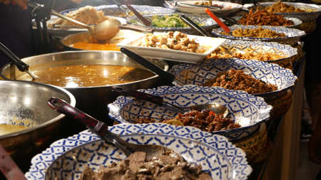 Bowls with various Asian dishes on stall. Bowls of assorted traditional Thai dishes placed on stall of street diner in evening. Oriental night market food court