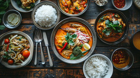 A vibrant display of Asian dishes featuring fresh ingredients, herbs, and spices arranged on a rustic wooden table, perfect for culinary inspiration.