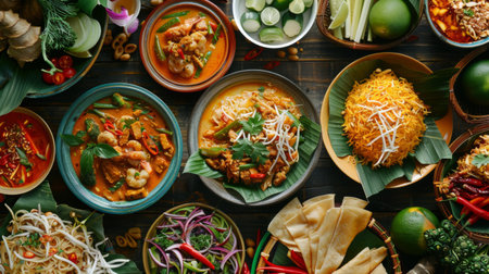 A stunning display of Thai dishes showcases vibrant colors and fresh ingredients on a wooden table, inviting food lovers to explore traditional flavors and culinary art.