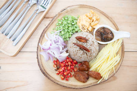 Rice topped with stir-fried pork, shrimp paste and chili on wooden plate