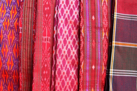 Colorful hand woven fabrics for sale at a local market in Thailand.