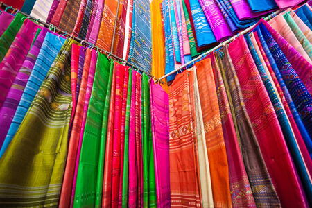 variegated multi colored fabrics in the Indian traditions at the exhibition