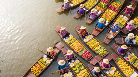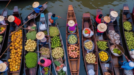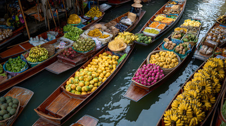Aerial view of colorful boats filled with fresh fruits navigating a lively waterway. This scene captures local trade and vibrant community life.