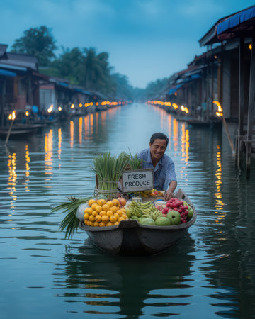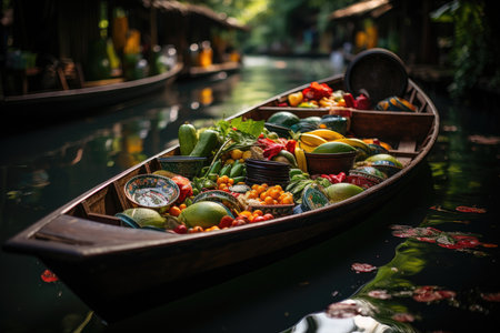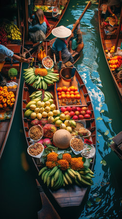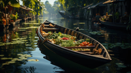 Experience the vibrant colors and bustling atmosphere of a traditional Thai floating market. A wooden boat, brimming with fresh fruits and vegetables, glides through a serene, sunlit canal.