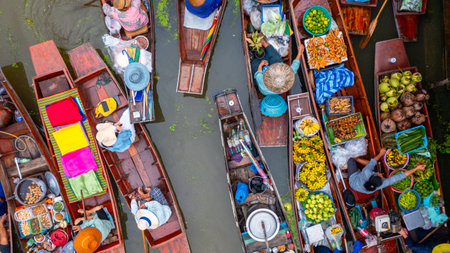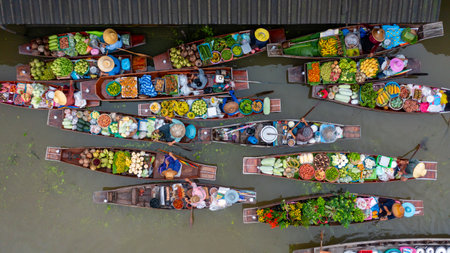 Aerial view Damnoen Saduak floating market, Farmer go to sell organic product, fruit, vegetable and Thai cuisine, Tourist visiting by boat, Ratchaburi, Thailand, Famous floating market in Thailand.