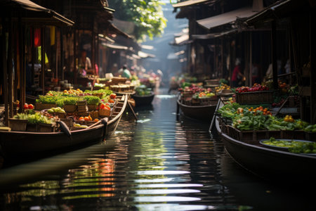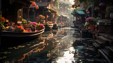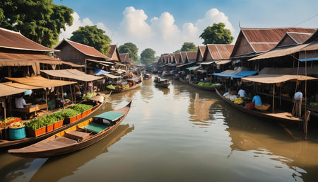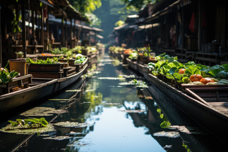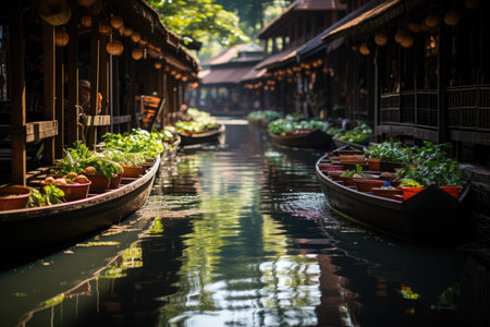 Floating Damnien Saduak market, Bangkok vibrant colors in serene waters., generative AI
