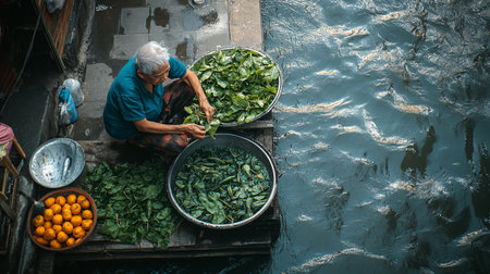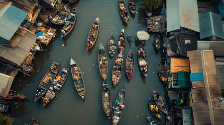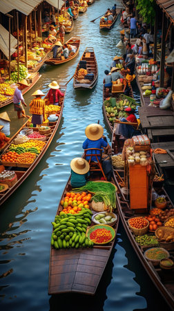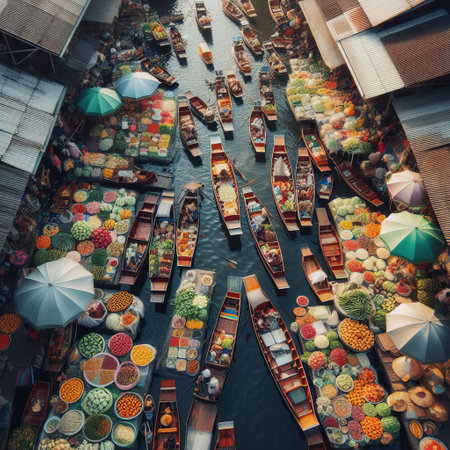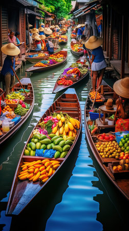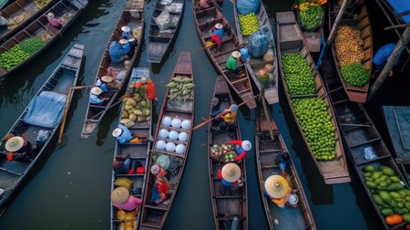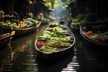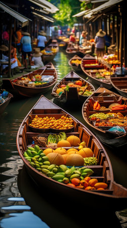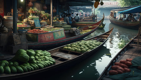 Boats laden with an abundance of fresh market goods crowd a traditional water market. The intricate dance of buying and selling is framed by the multitude of colors and shapes of umbrellas and produce. AI generation