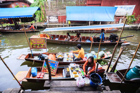 Ratchaburi, Thailand - February 26, 2012: Longtail boat with food and souvenir for sale in damnernsaduak floating market. This is a cultural heritage of Thailand. Activity of interest for tourists is take a boat visit the market along the river. And eat t