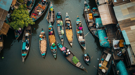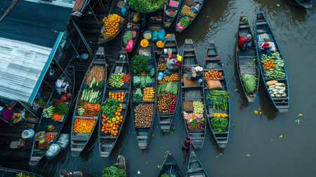 Overhead shot capturing the lively scene of a traditional floating market with boats laden with fresh produce.