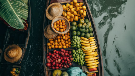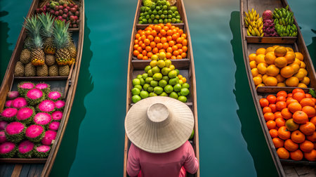 A vibrant aerial view of a floating market with wooden boats filled with fresh, colorful fruits. This lively scene showcases the beauty of local commerce and tropical abundance.