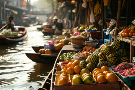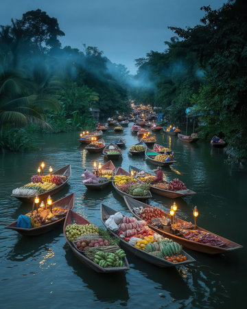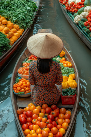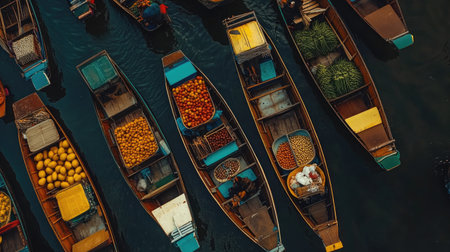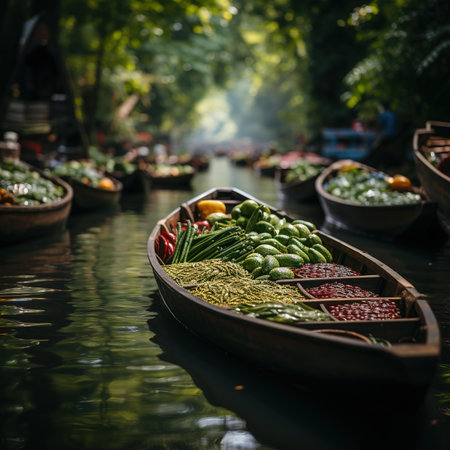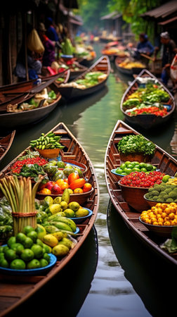 Vibrant market scene featuring colorful boats filled with fruits and vegetables, floating gently on calm water. A unique glimpse into local commerce.