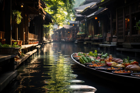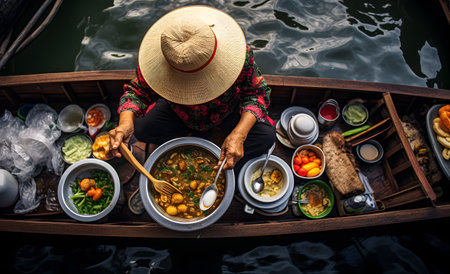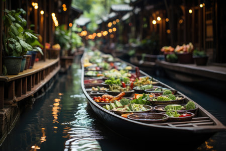 A traditional Thai floating market, Picturesque Floating food market river AI generated