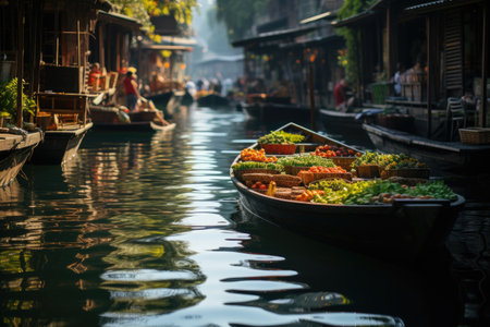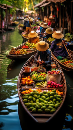 A traditional Thai floating market, Traditional Thai floating market with vendors selling fresh produce AI generated