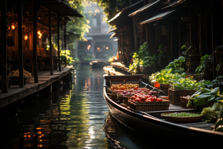 Rustic Thai Floating Market at Dawn with Fresh Produce