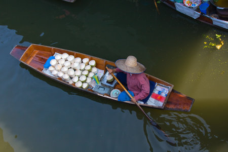 Unidentified Thai people sell fruits and vegetables at Damnoen Saduak floating market in Ratchaburi, Thailand.