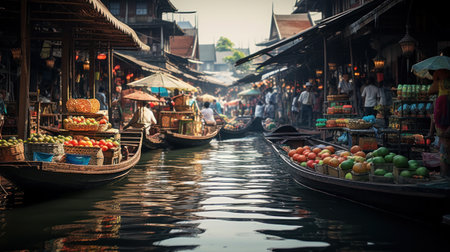 Floating market Bangkok Thailand created with generative AI technology. High quality illustration