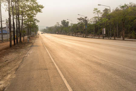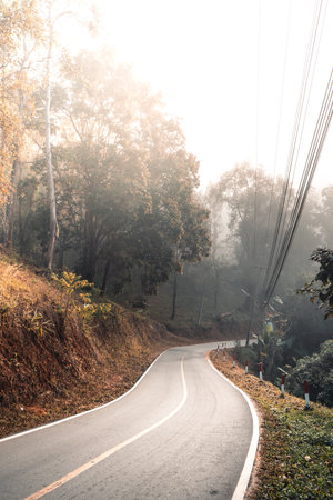 Empty Rural road with fog in the morning at countryside .Scene of road to mountain in Thailand close to Myanmar