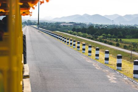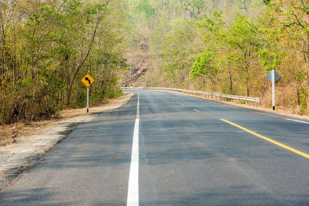 The beautiful long curved road in the countryside of Lampang province of Thailand. (Thai language on the yellow sign is mean 'Reduce speed limit')