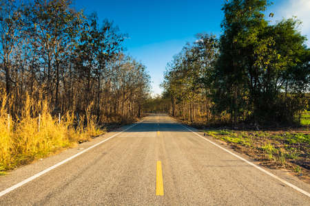 Straight road through the teak woods in countryside of Thailand