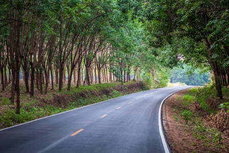 Asphalt road through the rubber trees farm in rural of Thailand