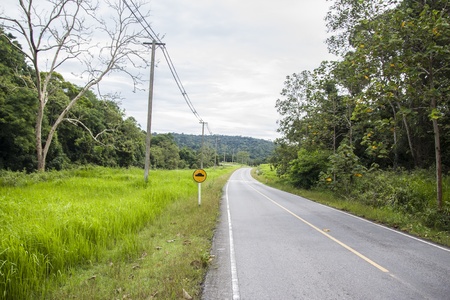 Empty road with a traffic sign in countryside of Thailand