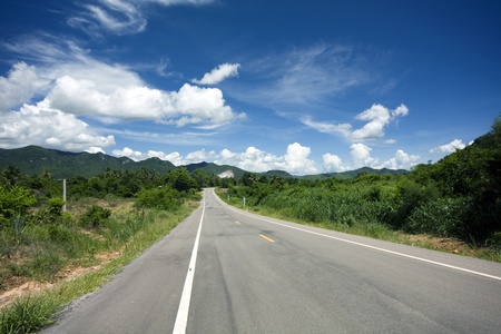 Beautiful landscape, white clouds, blue sky, mountains and long asphalt roads into the countryside.