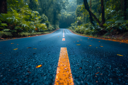 asphalt road with yellow diving line and forest background