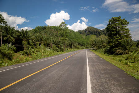 Country road with palm trees and blue sky in rural area of Thailand.