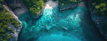 An aerial view captures a traditional wooden boat resting on clear turquoise water, surrounded by rocky coastal formations, inviting peaceful adventures.