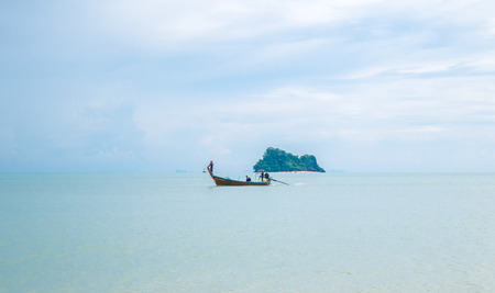 Traveling in Thailand. Amazing view from over Thai traditional wooden longtail boat travel on the sea tropical island with scenery of beautiful sea and sky.