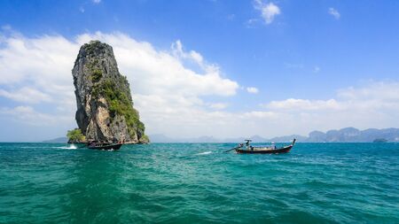 Beautiful sunny bay in Thailand. Tropical exotic holiday landscape. Long tail wooden boat ride over sea water.