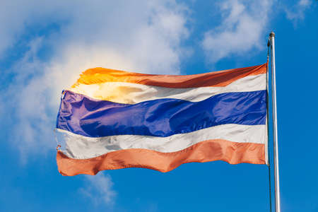 Thai National flag on bright blue sky background. Blown away by wind.