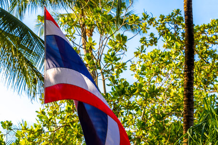 Thai flag blowing in the wind in tropical nature and blue sky in Patong Beach Kathu District Phuket Island Province Southern Thailand in Southeast Asia.