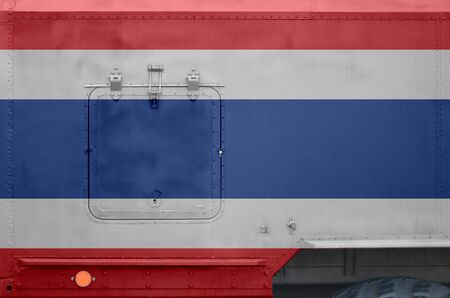 Thailand flag depicted on side part of military armored truck close up. Army forces vehicle conceptual background