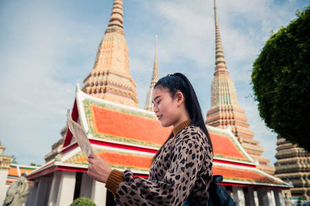 Asia tourist looking at map. Beautiful tourist attractions. generative ai