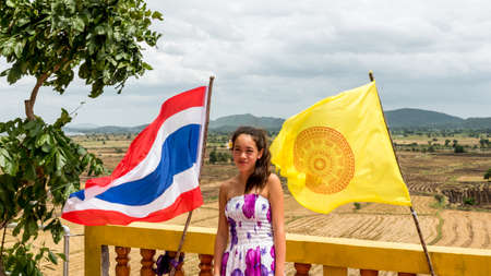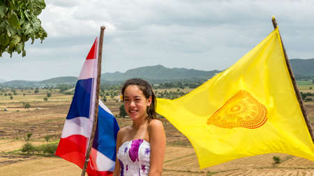 teen standing between thai and temple flags on windy day with fields and mountains in the back ground