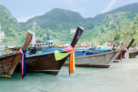 Traditional Thai wooden boats near sunny Thai beach on the Phi Phi island