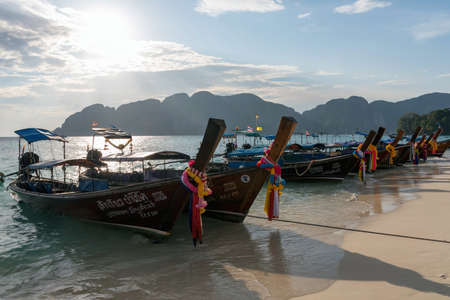 Phi Phi Island, Thailand - November 26 2019: traditional wooden longtail boats parked at a beach in Phi Phi Island. Clear water and clean beach.