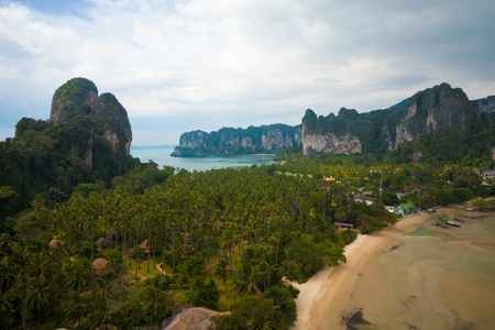 Aerial view of tropical island, rocks and palms, Railay beach, Krabi, Thailand. Tourism in Asia